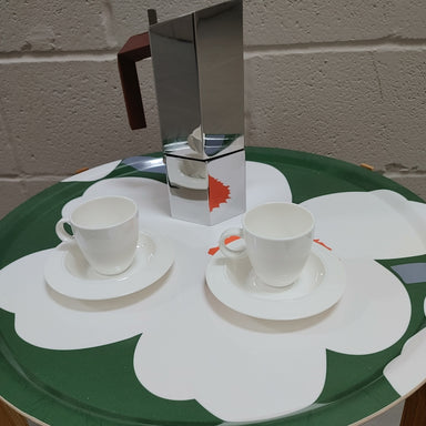 Set of two mocha cups with saucers in bone china. Set composed of two mocha coffee spoons in steel mirror polished, two mocha cups in porcelain, wh...