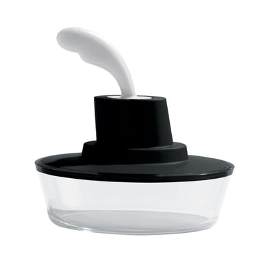 Container in thermoplastic resin, black with small spatula in 18/10 stainless steel. A creative receptacle, it can be used for sauces, butter, jam ...