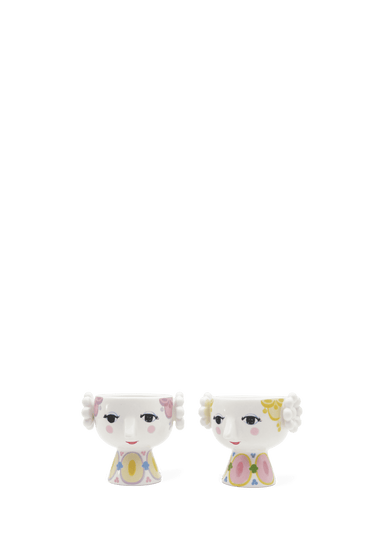 Rosy cheeked Eva candle holder from Bjørn Wiinblad in light blue, yellow and lilac colors. The candle holder is 9,5 cm high and can hold both a can...