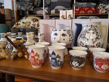 Hold Bjørn Wiinblad’s fairy-tale world in your hands. The mugs are decorated with a hand-applied print of a finely detailed woman’s face. The blue ...