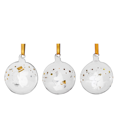 Create a cozy feeling of Christmas with these sparkling, Moomin themed glass balls. Each piece comes with a satin ribbon for hanging on the Christm...
