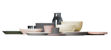 Plate in stoneware, black. A seemingly random collection of objects, the table service comprises a number of items including a tray, a board, a car...