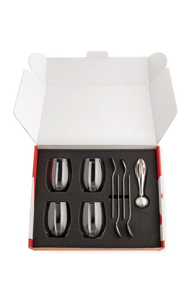 Set composed of: citrus-squeezer/pestle and 4 long drink spoons in 18/10 stainless steel, 4 long drink tumblers in crystalline glass. Designer AA....