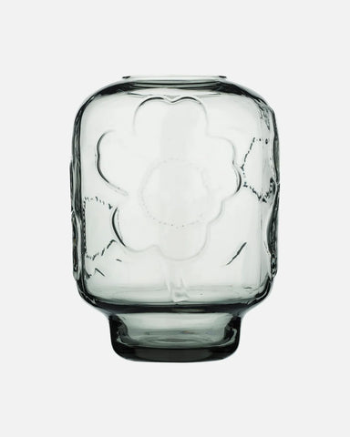 This glass vase features the embossed Unikko pattern. We recommend washing the vase by hand.This product is made of clear mouth-blown glass.This pr...
