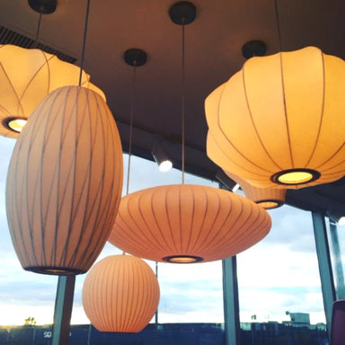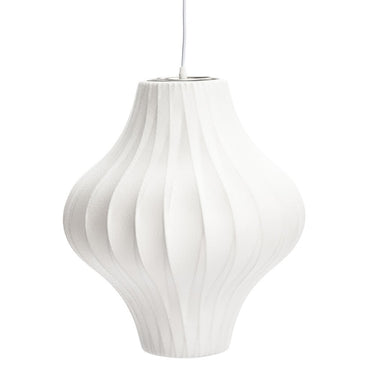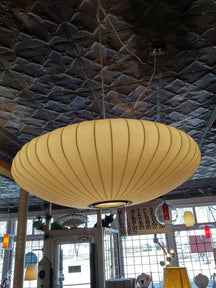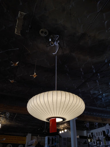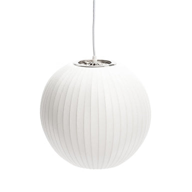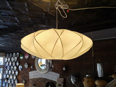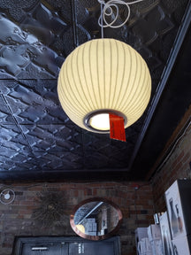 Cocoon-like plastic coating sprayed over round stainless steel wire frame with plated nickel canopy available in three sizes. This lamp is a replic...