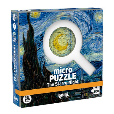 600pc micropuzzle - Starry Night by Van Gogh. Made in Barcelona using recycled cardboard and paper and packaged in sturdy cardboard. Finished puzzl...