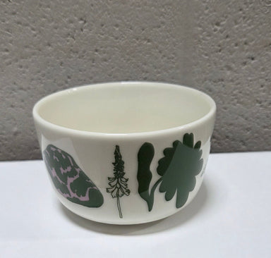 This small bowl made of white stoneware features the other the Elokuun Varjot pattern. The bowls have cork lids with Marimekko logos on the inside....