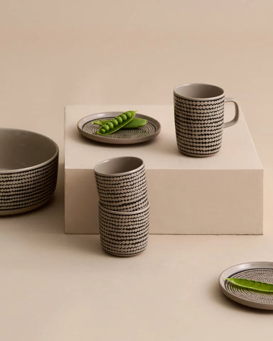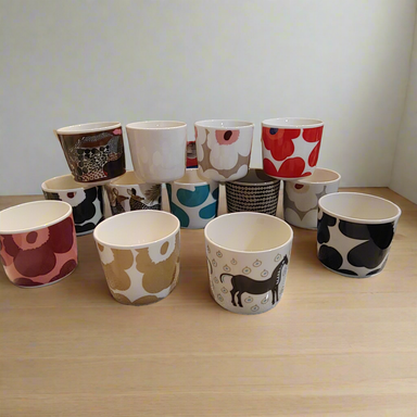 One Oiva cup without handle. The cups feature the Leikko pattern. They are made of dishwasher, oven, microwave, and freezer safe white stoneware. T...
