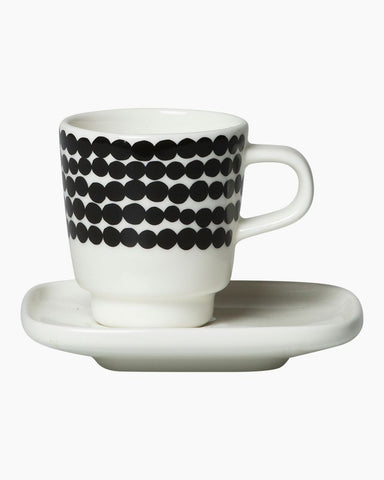 In the Räsymatto pattern on this Oiva espresso cup you can see a rag rug placed on the floor of a garden cottage, with rays of sun dancing on its f...