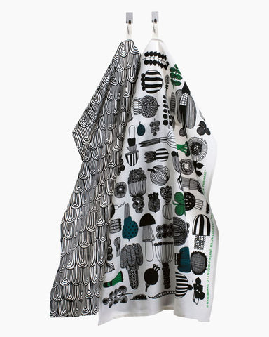 Two tea towels in a cotton-linen blend, each with a different pattern. The other has Puutarhurin parhaat motif and the other has Vellamo motif. S...