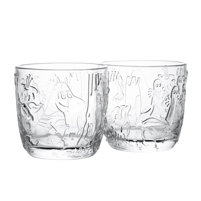 Explore the stunning embossed glassware collection inspired by Tove Jansson’s novel “Finn Family Moomintroll”. Each piece is decorated with beautiful textures that capture the magic of mystical forest while the Moomins are playing hide and seek. Moomin Arabia, tumbler clear 28 cl, 2pc