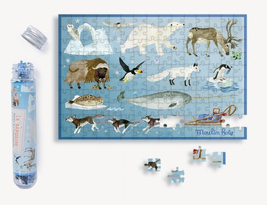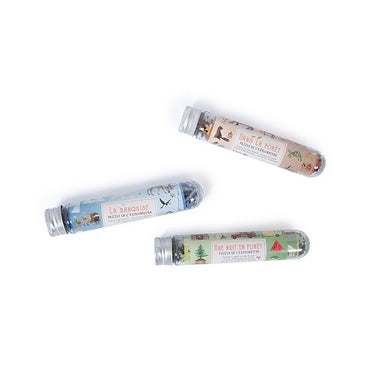 mini puzzles by Moulin Roty. Each puzzle includes 150 mini pieces. Finished puzzle size is 15x10cm. Assortment includes 3 tubes of Animals of the F...
