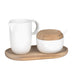 Bonjour Cream & Sugar Service With Tray prove that good things are found in small packages. Mug, jar and spoon of smooth porcelain with lid and tray of acacia wood create a fun presentation for morning coffee or tea time. Freeform edges and shapes create design interest and a sense of playfulness. Please note dimensions on this set as items are beautifully small. Unfinished acacia wood may be oiled as needed. Coordinate the set with other Bonjour dinnerware items from Räder. Bonjour - Good Day!