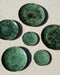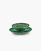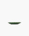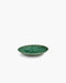 The green starter plate from the Verde Lanza collection by Pascale Naessens is inspired by the green-painted wooden windows, doors, and sparse vegetation in Lanzarote, where she often resides. The sun-worn glaze, a shade of green that complements food from around the world, is enriched with a shell-like texture formed by Naessens herself.