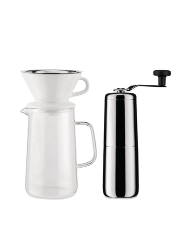Set for Slow coffee composed of coffee grinder in 18/10 stainless steel, jug in heat resistant glass, filter-holder in porcelain and net filter in ...