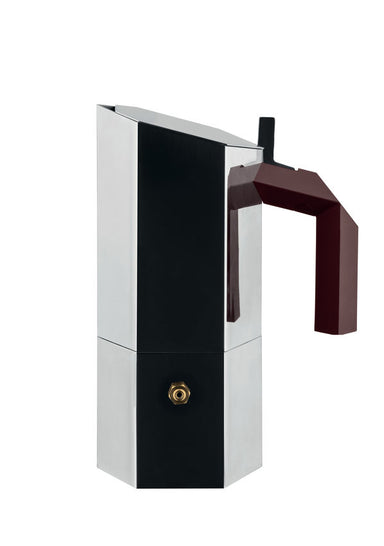 Espresso coffee maker in aluminium casting. Handle and knob in PA, red. 6 cups. The espresso coffee maker Pulcina, designed by Michele de Lucchi is...