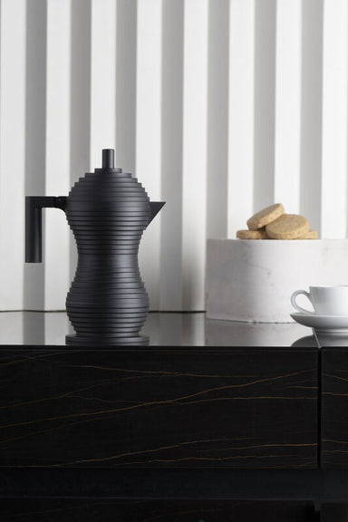 Espresso coffee maker in aluminium casting, black. Handle and knob in PA, black. 6 cups. The espresso coffee maker Pulcina, designed by Michele de ...