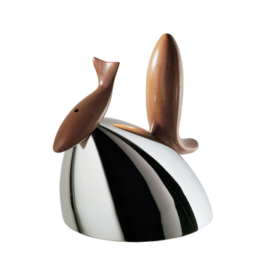 Kettle in 18/10 stainless steel mirror polished with handle and cap with melodic whistle in mahogany wood. “I started to draw fish. Without any sp...