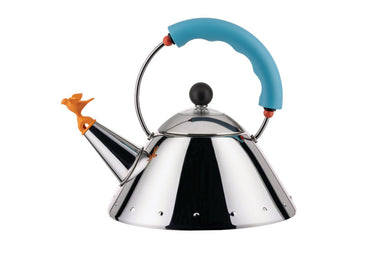Kettle in 18/10 stainless steel mirror polished with handle and small bird-shaped whistle in PA, light blue. Magnetic steel bottom suitable for ind...