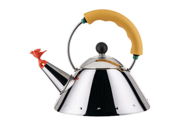Kettle in 18/10 stainless steel mirror polished with handle and small bird-shaped whistle in PA, yellow. Magnetic steel bottom suitable for inducti...