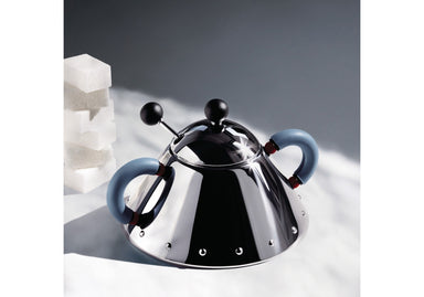 Sugar bowl with spoon in 18/10 and PA, light blue. Designed by Michael Graves. <>. (Alberto Alessi) On display since 1988 in the Kunstmuseum ...