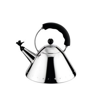 Kettle in 18/10 stainless steel mirror polished with handle and small bird-shaped whistle in PA, black. Magnetic steel bottom suitable for inductio...
