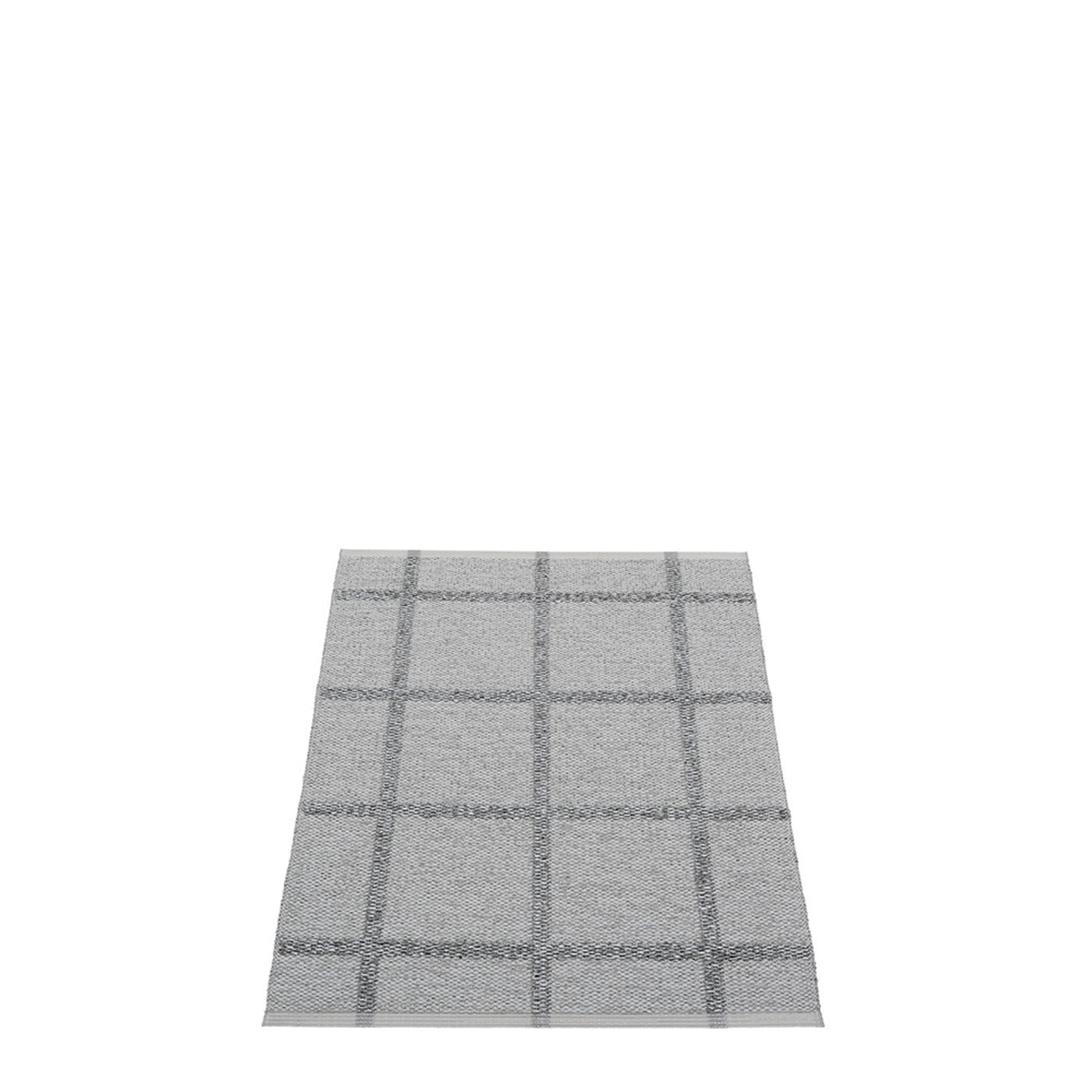 ADA is inspired by wallpaper where chequered pattern constantly is a trend. But ADA is more than a simple square. By challenging our weavers to develop and refine the weaving technology in the rug, the end result is a truly ground-breaking technique. Unlike anything else in our segment, two techniques meet each other both vertically and horizontally. Thanks to the material's durability, the rug has a long lifespan, which gives a low environmental impact. Pappelina plastic rug ADA Grey Granit Metallic