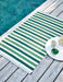 At Pappelina, stripes have always held a special place in our design library, serving as the heart of our creations. With TEO, we aimed to infuse more colors, joy, and playfulness into our rugs, challenging the prevailing trends of natural colors. TEO's design is a celebration of vibrant hues and the timeless allure of stripes. The inspiration behind this pattern was to encourage the use of multiple colors, creating a captivating visual experience. Each TEO rug features a combination of three colors carefully selected to harmonize and complement one another. This thoughtful color palette adds depth and dimension to the design, infusing your space with a lively and polished aesthetic. To elevate the elegance of TEO even further, we added a fourth matching color to the exclusive handsewn hemmed edge. This finishing detail not only enhances the overall look of the rug but also showcases our dedication to quality craftsmanship. Embrace the charm and vibrant spirit of TEO, where colors and stripes unite in perfect harmony. The rug has high UV resistance and can be used both indoors and outdoors. Pappelina plastic rug TEO Dark Green Grass Green Vanilla