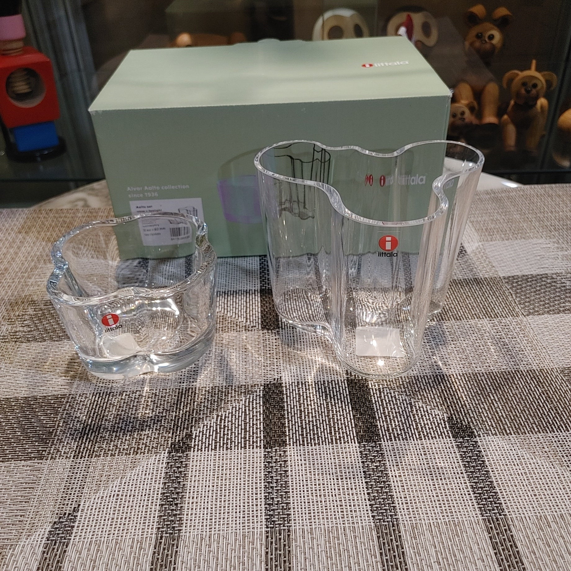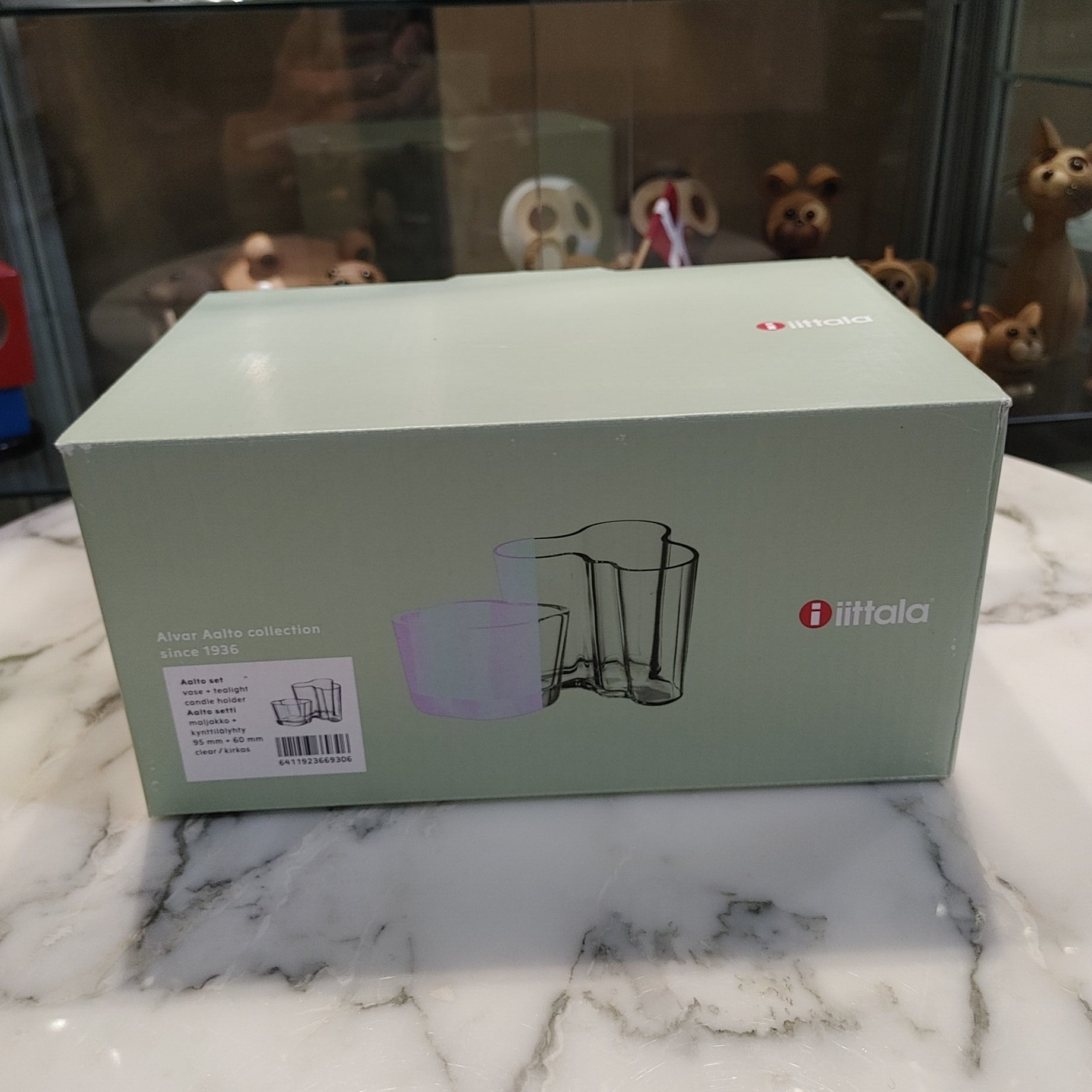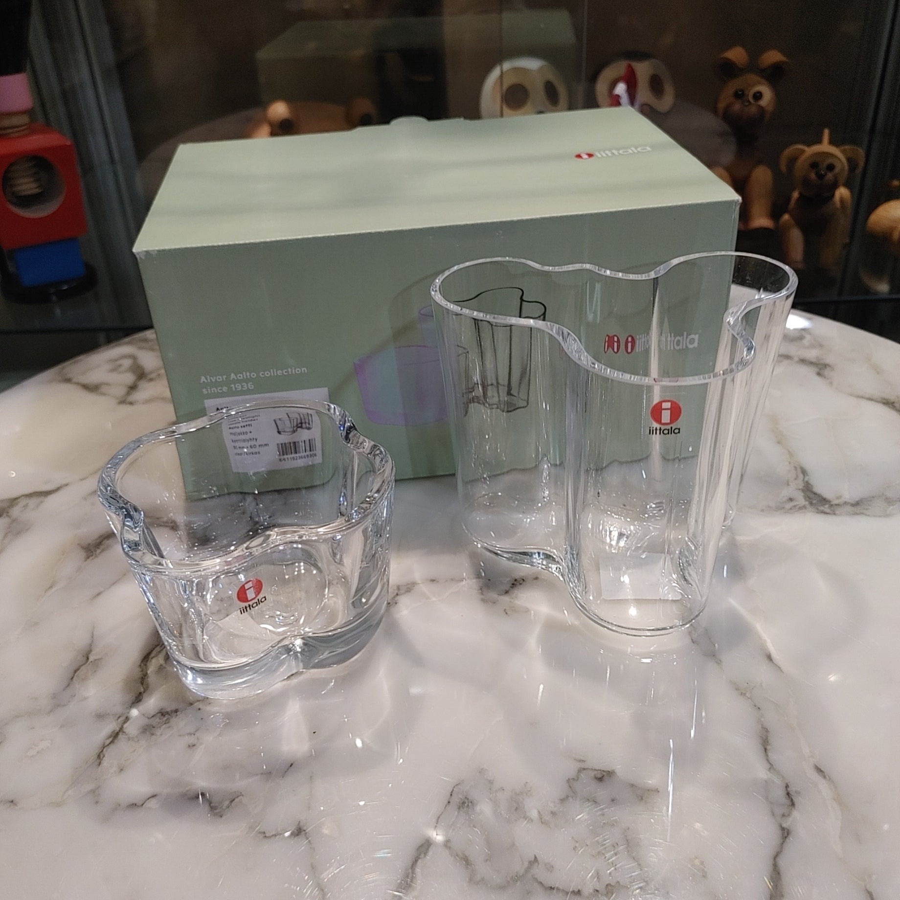 A gift set with a vase and a votive in mouth-blown glass, that belongs to the popular series Alvar Aalto from Iittala.