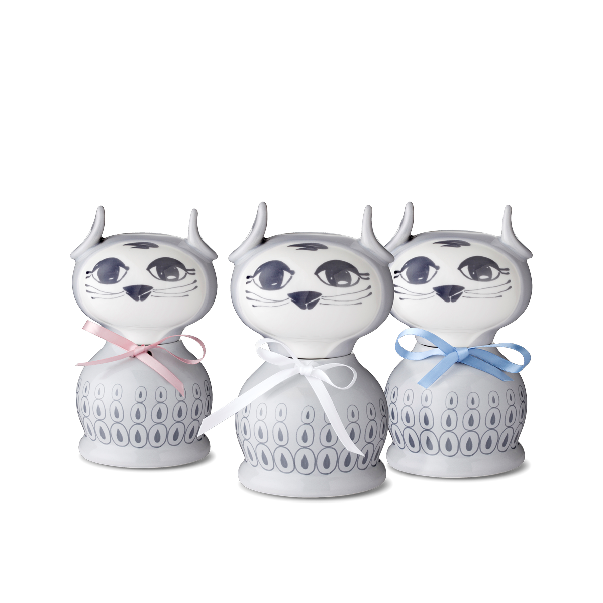 Bjørn Wiinblad’s beautiful Miranda cat money box is a reinterpretation of the original cat money box designed back in 1969. The cat stands 17 cm tall and is made of white porcelain with a beautiful light grey glaze on the body. It is shaped exactly the way Wiinblad designed it, and consists of two parts – top and bottom – connected by a ribbon tied in a little bow at the front. The Miranda cat money box comes with a white bow, plus two extra ribbons – pink and blue – so you can choose.