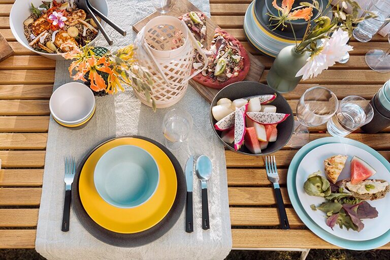 Outdoor dinnerware so stylish that you'd secretely like to use it inside too. That's exactly what we have achieved with the new Mepal Bloom collection. Look up close: the dinnerware has a unique speckled matt finish inspired by pebbles that have been sanded down by water and wind. We have chosen four natural colours which all mix and match together. The entire series is also stackable, sturdy and lightweight.All you need for an intimate rooftop dinner or sizzling summer barbeque.