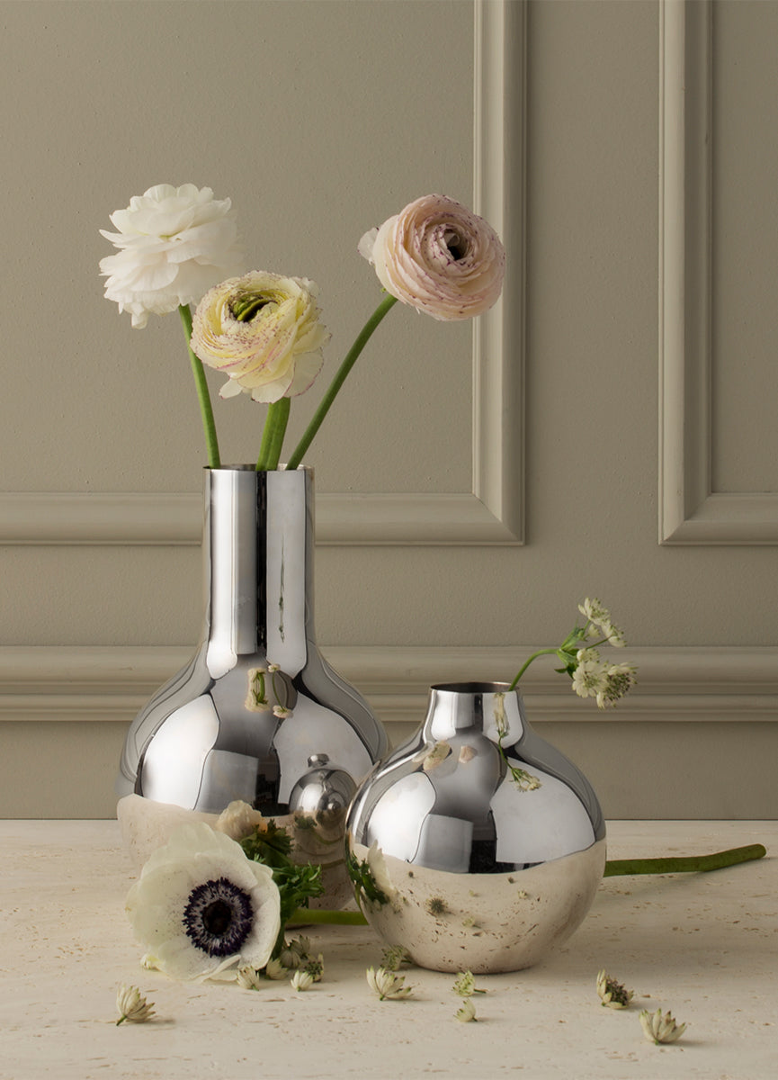 Olivia Herms words about the vases; The vases called Boule, which means "sphere" in french, embodies the most fundamental form of "containing" - the round bowl. The nearly perfect sphere containing the water opens up to a collar that holds the flowers. The three sizes accommodate different forms and sizes of bouquets. Designed 2016.