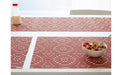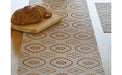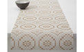 OVERSHOT With lively yet refined rows of interlocking concentric circles, Overshot is a contemporary interpretation of traditional textiles. It is named for a weave structure with a long history and a distinctive construction: as the weft yarn jumps or "shoots" over the foundational plain weave of the warp yarns, a decorative pattern layer is created. This design takes inspiration from vintage American coverlets. Used as the topmost covering on a bed and distinct from quilts, these woven textiles were especially popular during the early to midnineteenth century. The earliest examples were made with an overshot weave, and this craft continues today. Suitable for indoor and outdoor use. Made in the USA with TerraStrand® and Microban®. Backed with flexible, slip-resistant latex and finished with self-bound edges. Free of phthalates. Custom sizes available