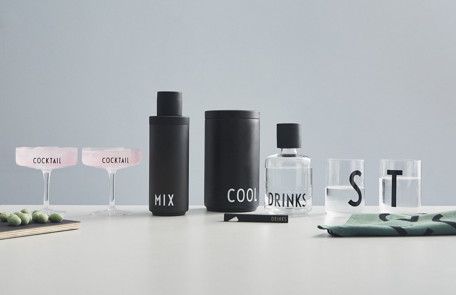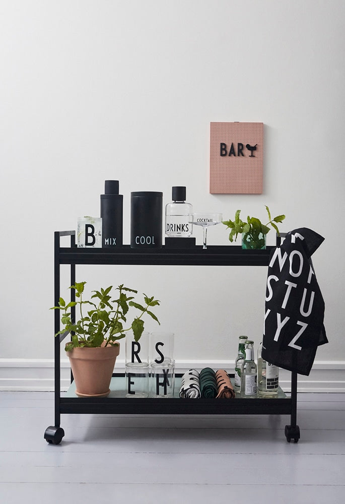 Transparent soda lime glass printed with “COCKTAILS”.