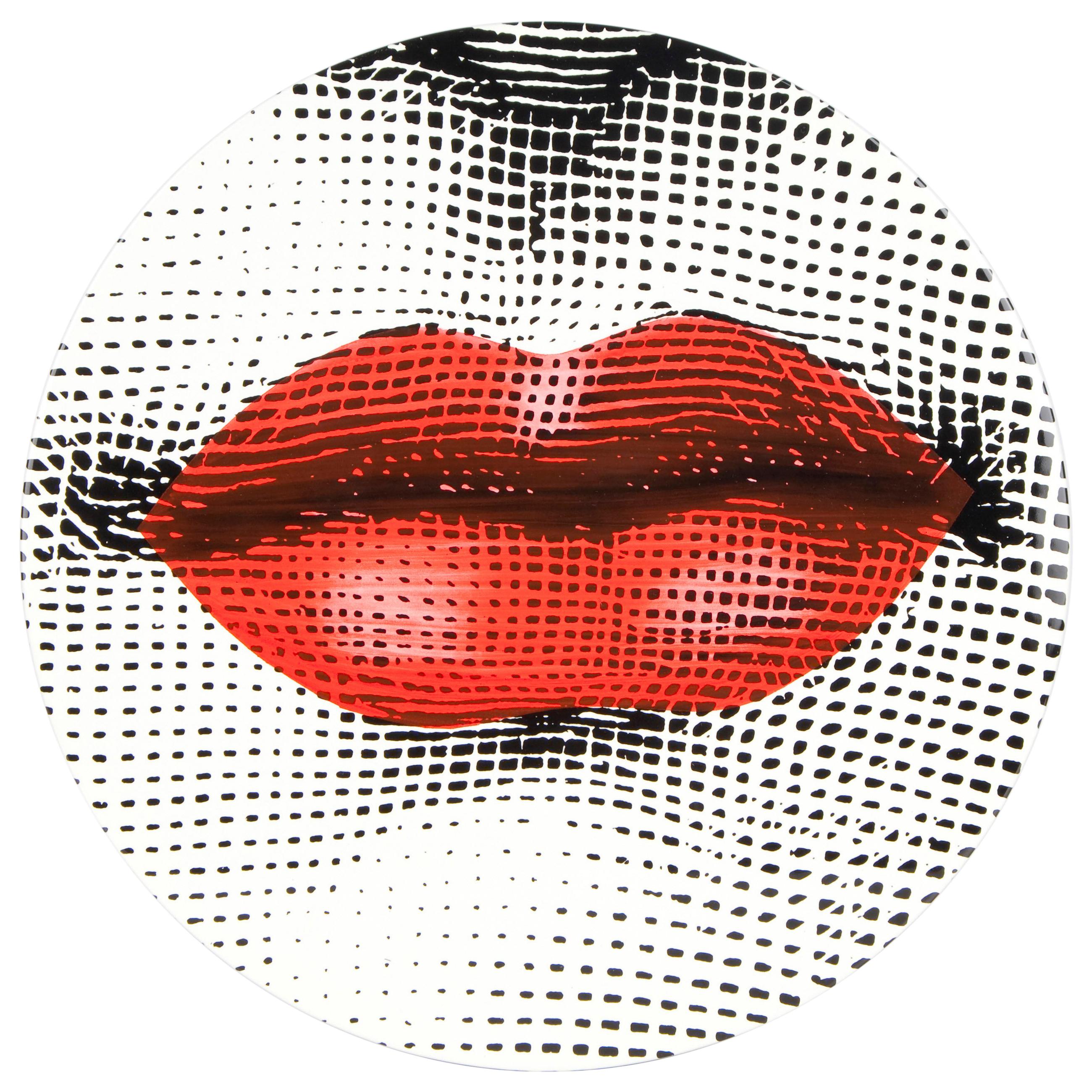 The finely crafted table is decorated with the bocca image which have been painted by hand and lacquered using traditional Fornasetti techniques . The table top sits upon brass metal tripod legs.