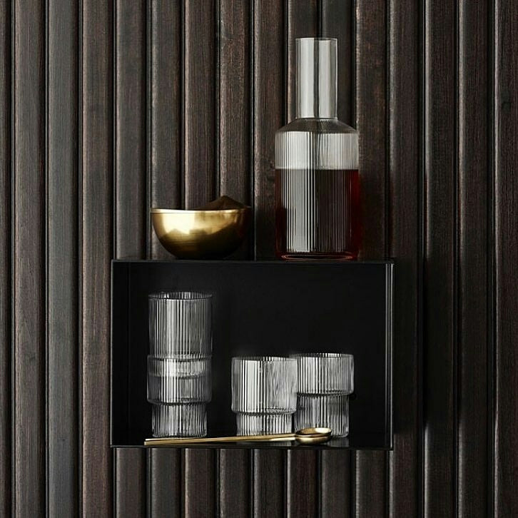Mouth blown into the mould, this set of four glasses features a beautiful ripple surface. The vertical ripples add a strong and sophisticated look and the varied geometric shapes create dynamic and energy between the glasses and function as a stackable design element. Pair them with the matching carafe for a stylish set at breakfast, lunch or dinner.