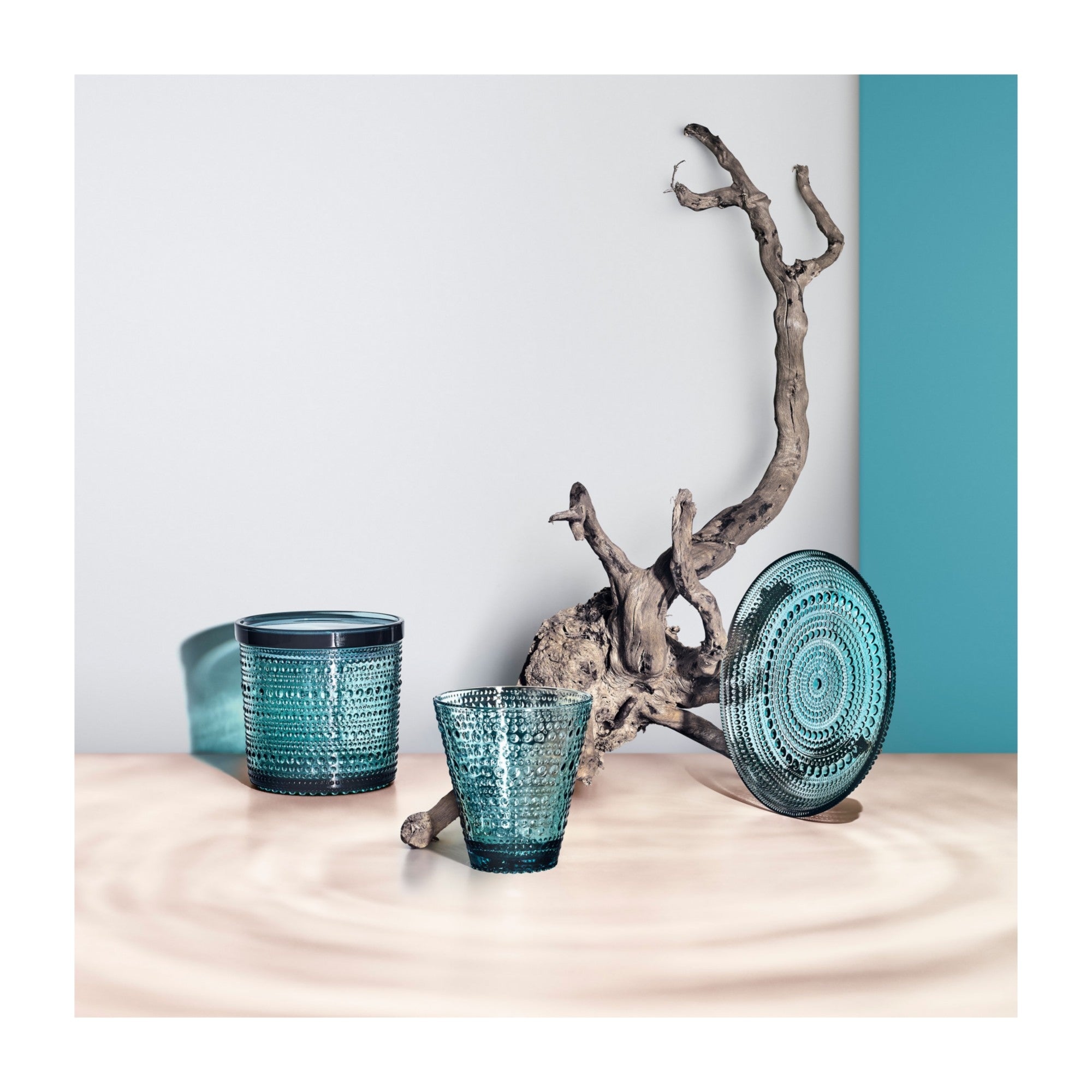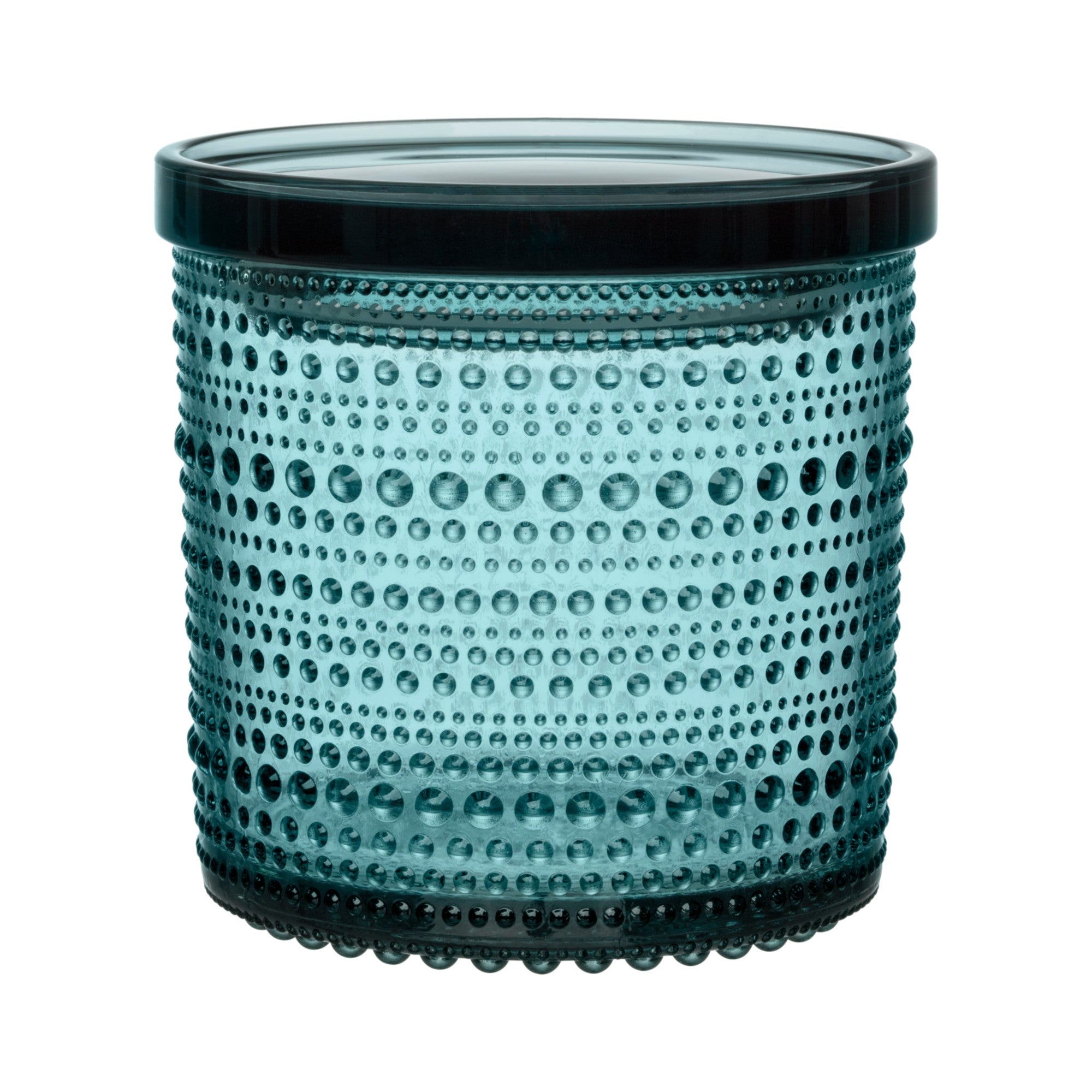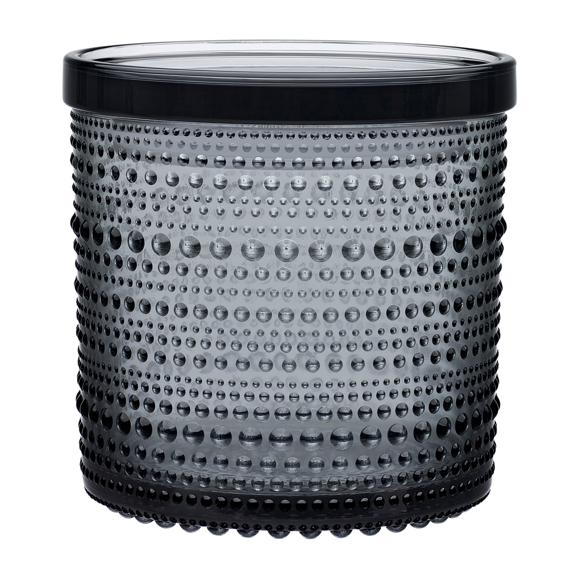 Finnish design legend, Oiva Toikka, was exploring ways to hide joint marks in glass when he invented the groundbreaking raised droplet design that makes Kastehelmi so distinct. Kastehelmi features rings of delicate glass bubbles designed to resemble strings of dewdrops glistening under the morning sun. Each piece plays with light in a way that truly showcases the reflective beauty of the glass. Iittala’s beloved Kastehelmi collection offers a wide range of versatile, tactile pieces that are both functional and decorative. The clear Kastehelmi jar offers playful storage suited for any interior. Perfect for storing small household items, food, spices or to use as a serving dish. Plastic lid. Great gift idea.