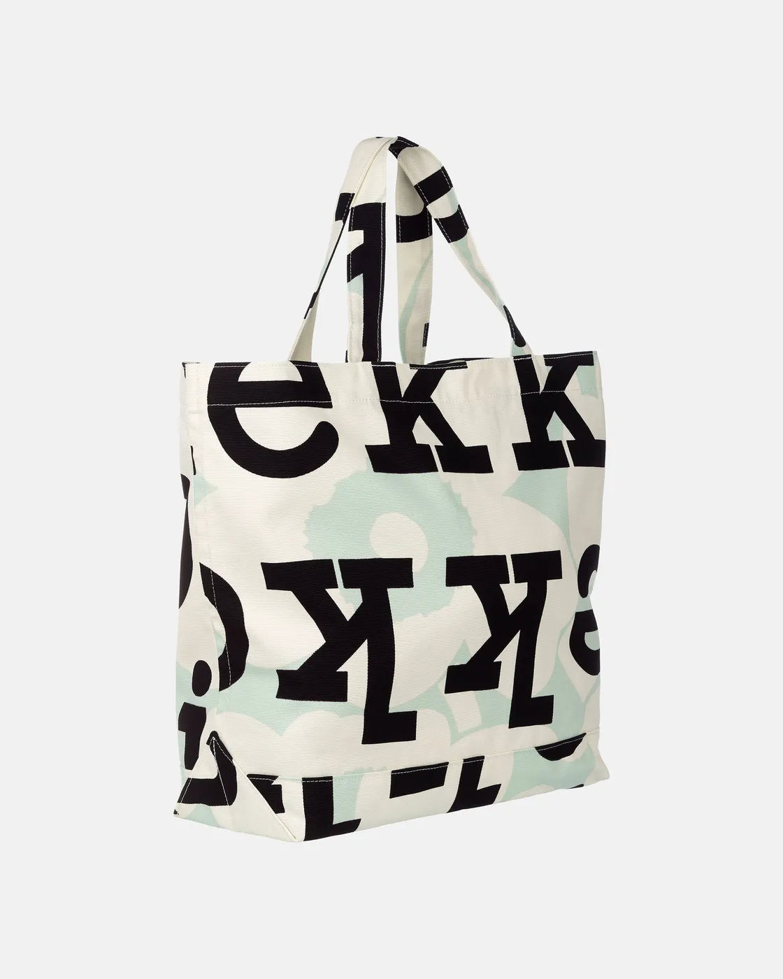 The Ahkera tote bag is made of lightweight cotton canvas, which features the Logo pattern printed on top of the Unikko pattern. The large bag has two sturdy handles. Printed in Helsinki.