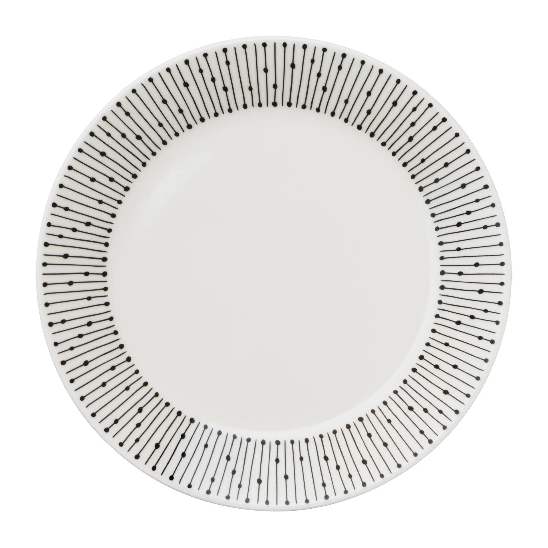 Mainio Sarastus plate 15 cm by Finnish Arabia - a small plate made of in vitro porcelain with a border featuring organic stripes and small dots. The pieces in the Mainio Sarastus collection are designed to be stacked and can be mix and matched with each other. You can use the plates as lids for the bowls so you can store food in your fridge or freezer. All the pieces can be used in the oven or microwave and are ideal for both everyday use and special occasions.