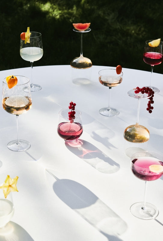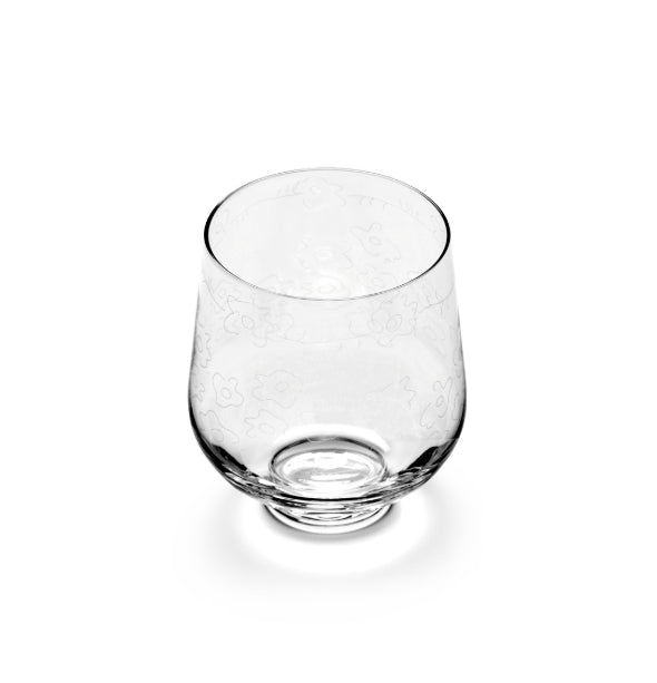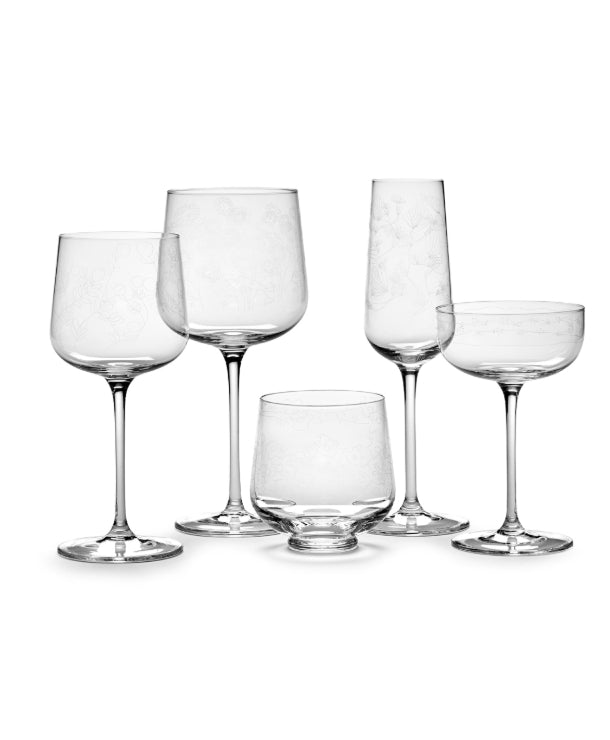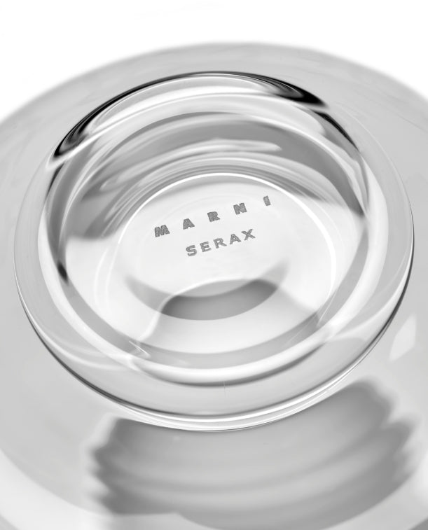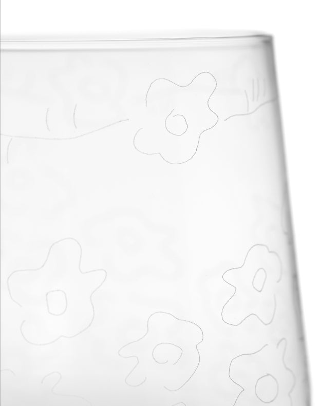 Besides a porcelain dinnerware and coffee set, Midnight Flowers - Italian fashion house Marni’s first tableware collection - also comprises 5 refined glasses: a water glass on a small base, a champagne coupe and flute, and wine glasses. Each glass features a laser-engraved flower motif. This labor-intensive process is repeated three times for an optimal effect. Finally, the glass is finished with an oil-based polish to enhance the subtle transparency of the engraved motif. The result is an artistic set of glasses worthy of the renowned fashion house.