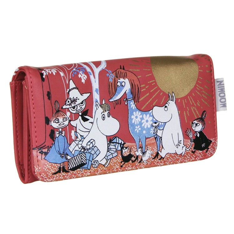 Moomin and friends wading through the flower strewn river illustration. Beautiful wallet perfect for everyday use! Wallet closes with a snap fastener, pockets for cards on the inside and one for your ID.