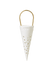 Nobili Cone snow white H: 6.1" Ø: 1.8" The beautiful Nobili Christmas series is designed to get the Christmas spirit into the living rooms in a modern elegant way. This year, the series will be joined by two cones in snow-white and olive green, in H14.5 cm and H18cm. The hanging cones are made of bone china with glossy olive green or snow-white icing with shinny gold metal handle and fit perfectly as decorations in all Christmas homes. The cones are a part of Nobili Christmas trees, and have the many hand-carved small decorative holes. The cones are exclusively for hanging and decoration. The cones belong on the Christmas tree, and traditionally it should be filled with Christmas goodies. Christmas cones is traditionally one of the oldest types of Christmas tree decorations. Designed by design duo R7B - Mette Bache and Barbara Bendix Becker