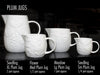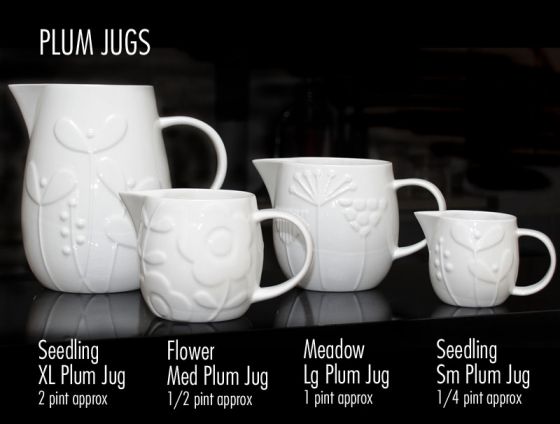 The Plum Jugs are available in four different sizes, each with a different pattern. They look great when displayed as a set. The jugs mix and match splendidly with our other white bone china ranges. This is the smallest.