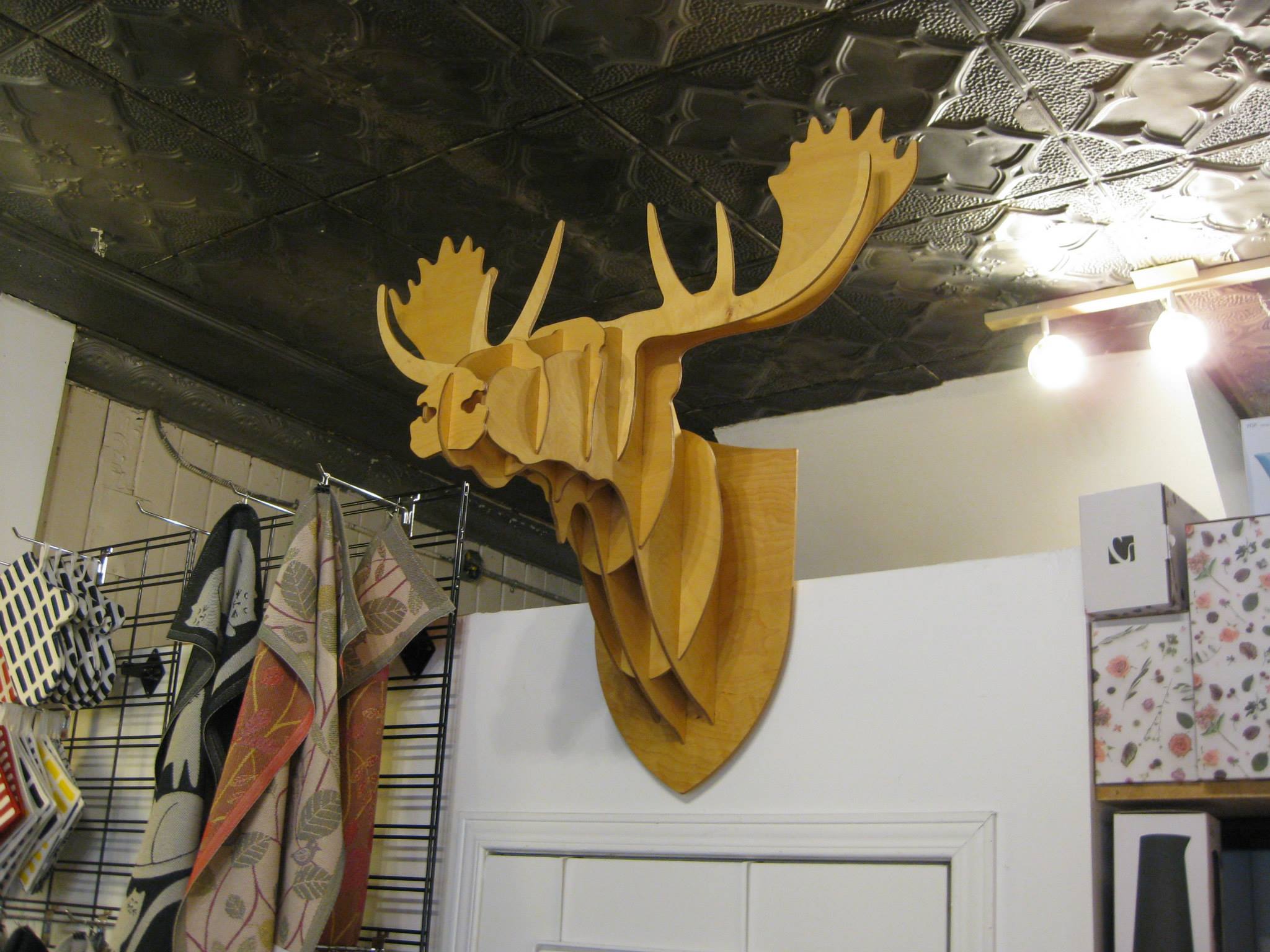 Wooden Moose head made of danish oiled cherry wood plywood. Flat packed, easy to assemble and to install, this product will surely turn heads!